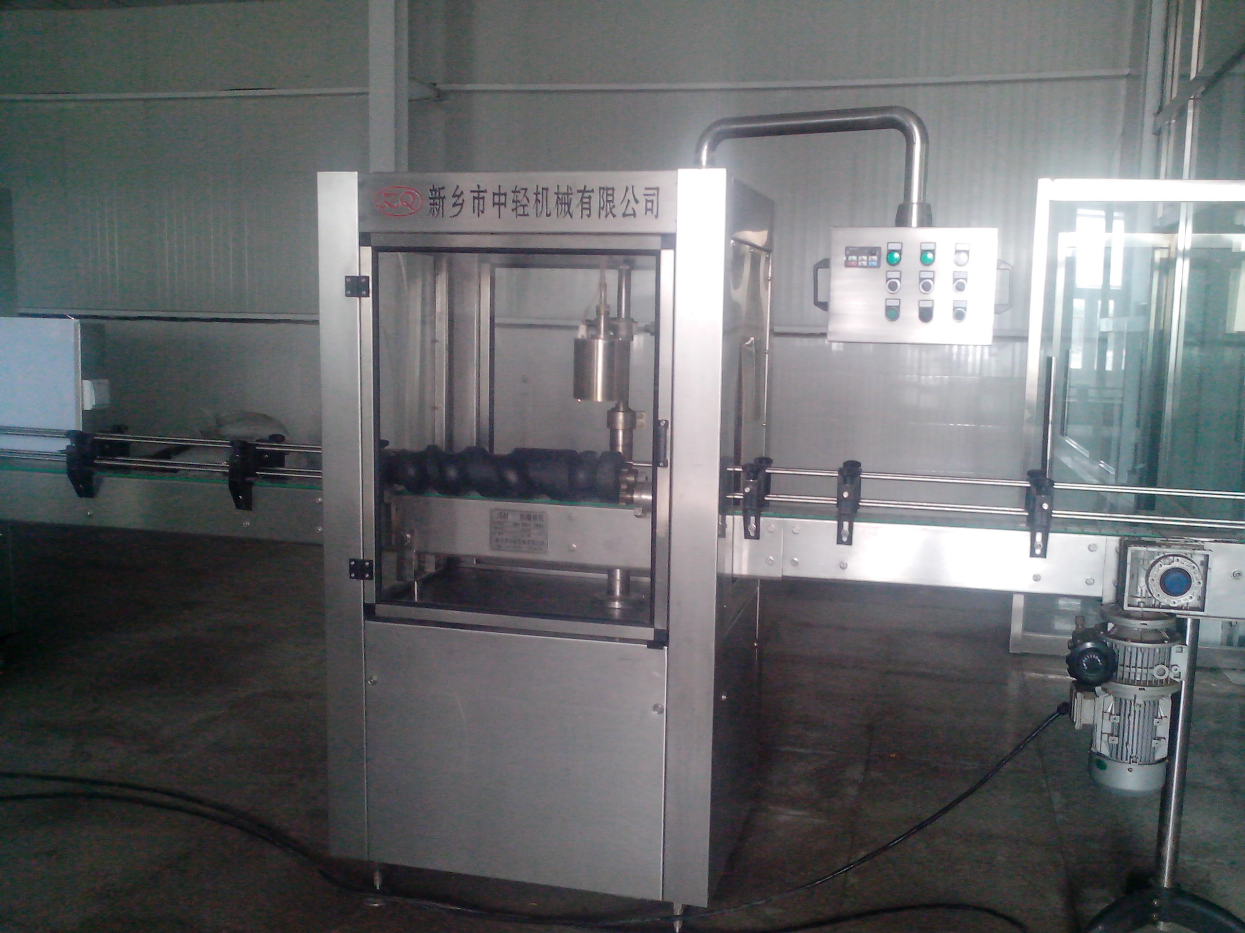 本機是參照國外多個廠家的熱縮帽技術結合本公司的多年設計制造經驗設計而成的一種新型罩式熱膠帽收縮機。適用于3000瓶/時葡萄酒、白酒、果酒裝線上對PVC熱縮的膠帽的熱縮。本機自動化程度較高,結構緊湊,操作方便,耗能低,熱收縮效果好。整機由機架、傳動系統、進瓶螺旋裝置、熱收縮裝置、防護罩裝置(注:JSM—1H型有護罩,JSM—1W無護罩)等組成。主傳動系統電機通過變頻器無級調速帶動熱縮頭上下運動,對PVC熱縮膠帽進行熱縮,熱縮溫度可由控制旋鈕調節。