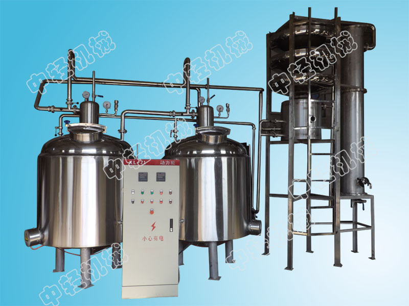 本機組是一種間斷蒸餾設備,主要供作果酒廠蒸餾發酵后的果渣等固體物料和發酵醪液等液體物料。本機組的蒸餾鍋采用電熱管加熱,可在無鍋爐供汽的條件下進行蒸餾。